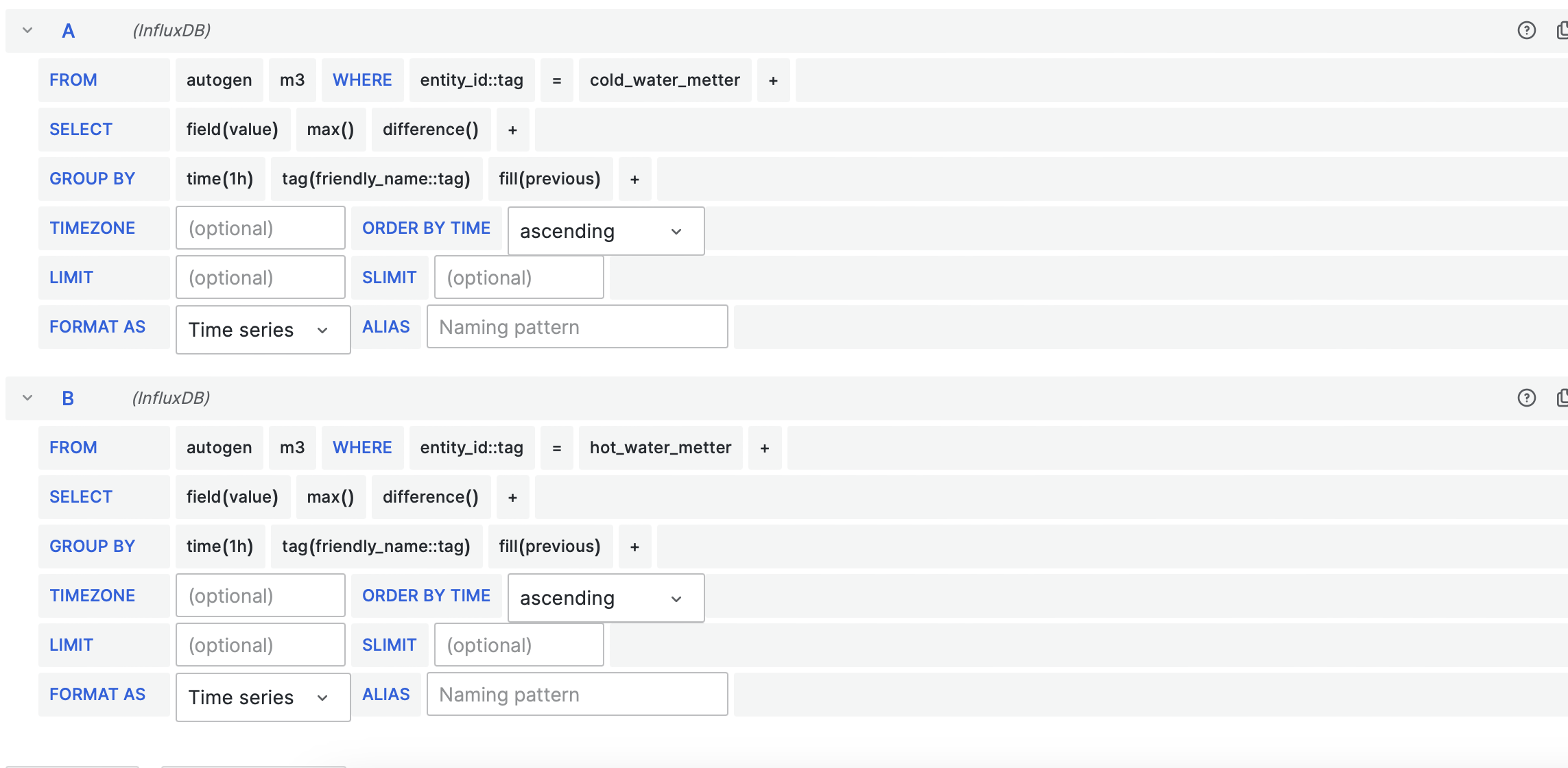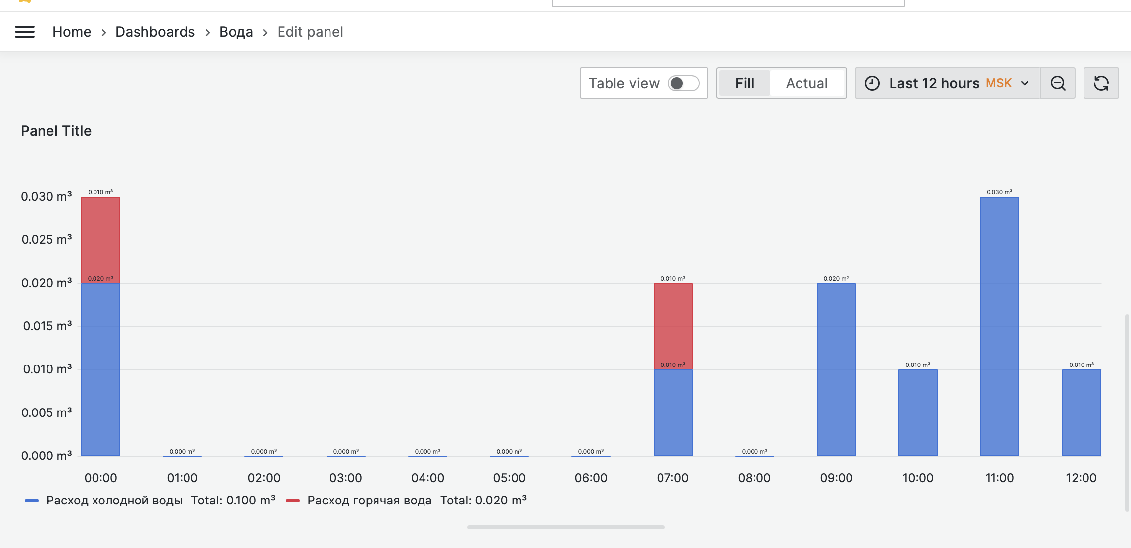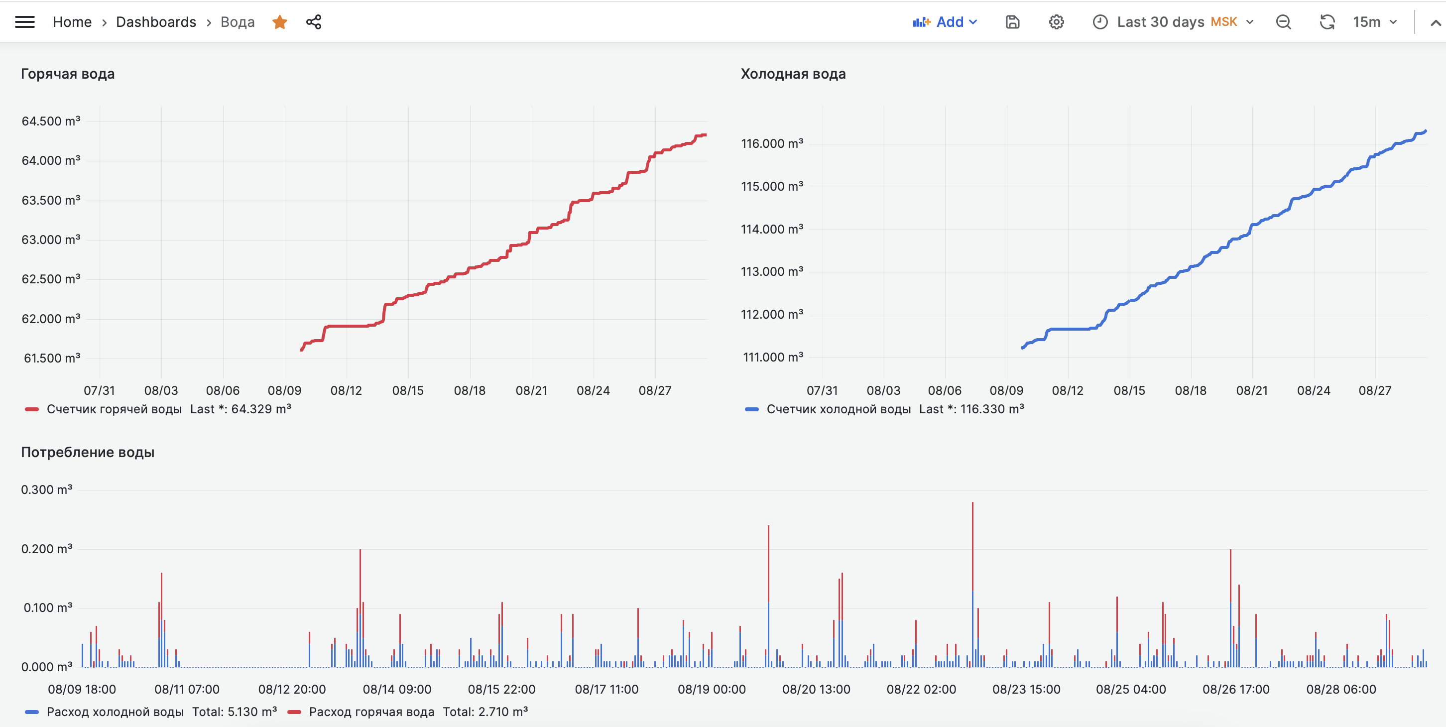 По прошествии нескольких дней после настройки InfluxDB в базе накопилось достаточно данных. Отобразим это в виде отчета. Меня всегда интересовал расход воды в доме, по этому и займемся им.